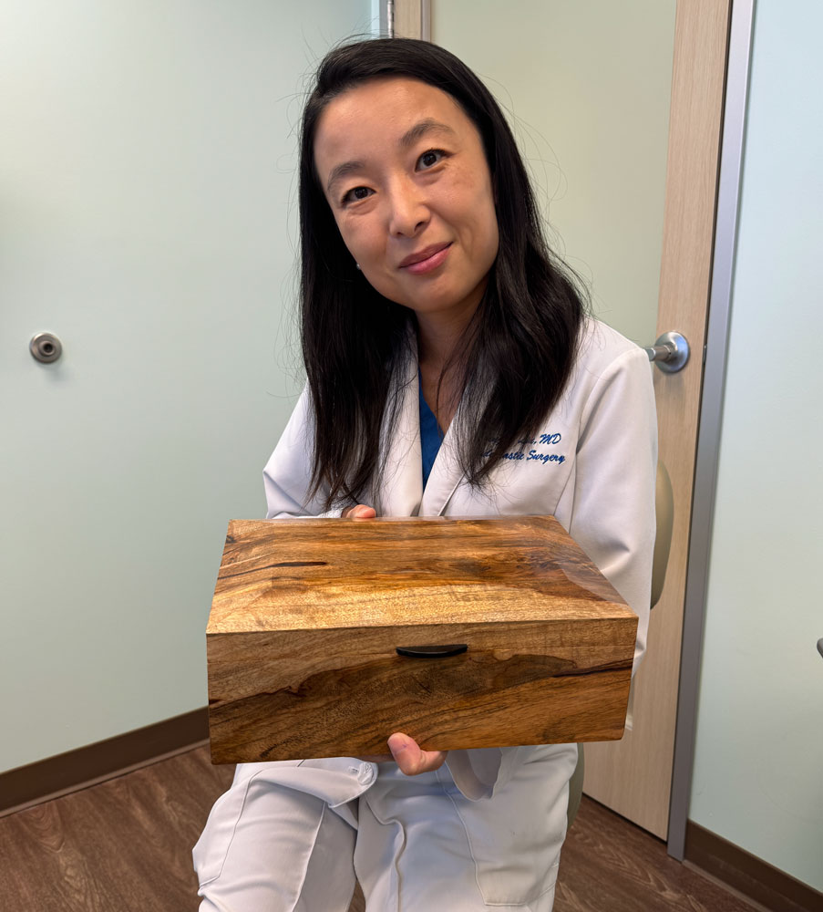 7/10/2025 I had some basal cell cancer on the lower eyelid of my left eye. Basal cell cancer is not that dangerous but it was in a bad place on my eyelid. I had it removed with a Moh's procedure but that then required reconstruction surgery. I had seen Dr. Liu, who specializes in surgery around the eyes, and she performed the reconstruction on July 3rd. I needed something to do while recovering from the surgery and decided to make a box for her. Here's how it came out. I used about the last of this wood that I had.