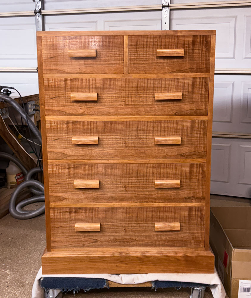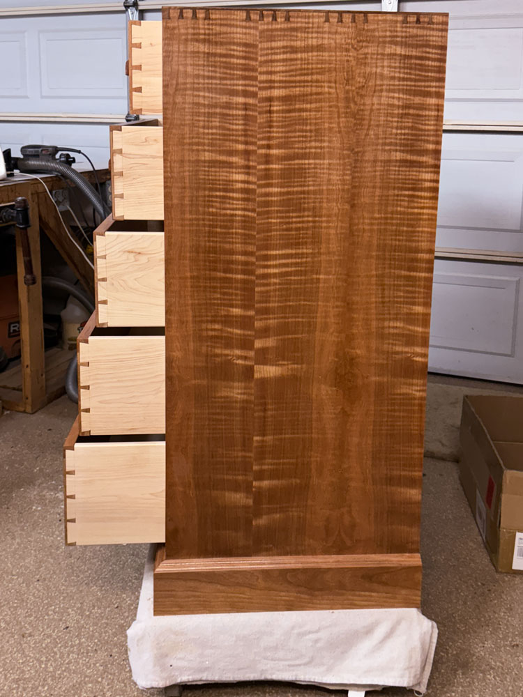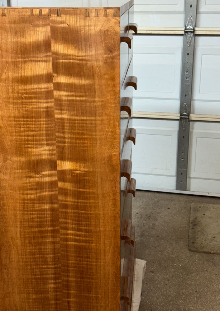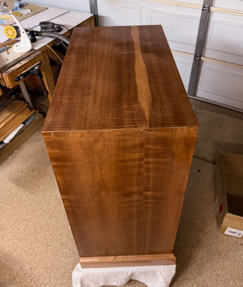 The finish is wiped on dewaxed shellac (SealCoat), with Target Coatings EM6000 water borne lacquer over it. I started the project on May 13, 2025, so it was 48 days from start to finish.