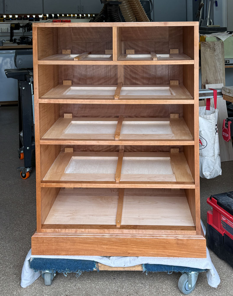 [Added note: Here's a view into the case, without the drawers. I put in a center guide bar for each drawer but I don't think it made much difference. The drawers are really guided by the sides of the chest. I built another chest of drawers many years ago and didn't put in the center guide bar and I can't tell the difference in the operation of the drawers.