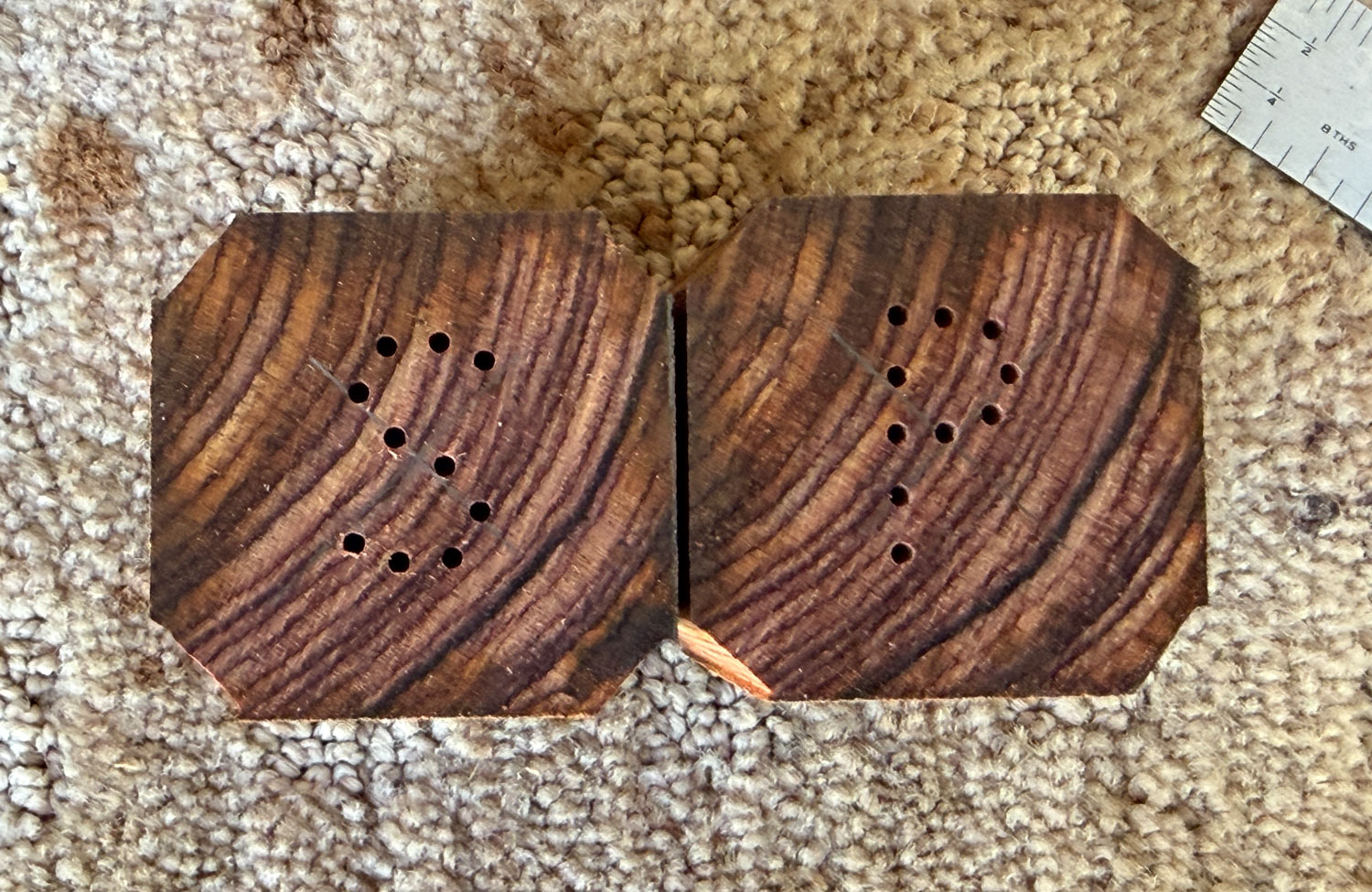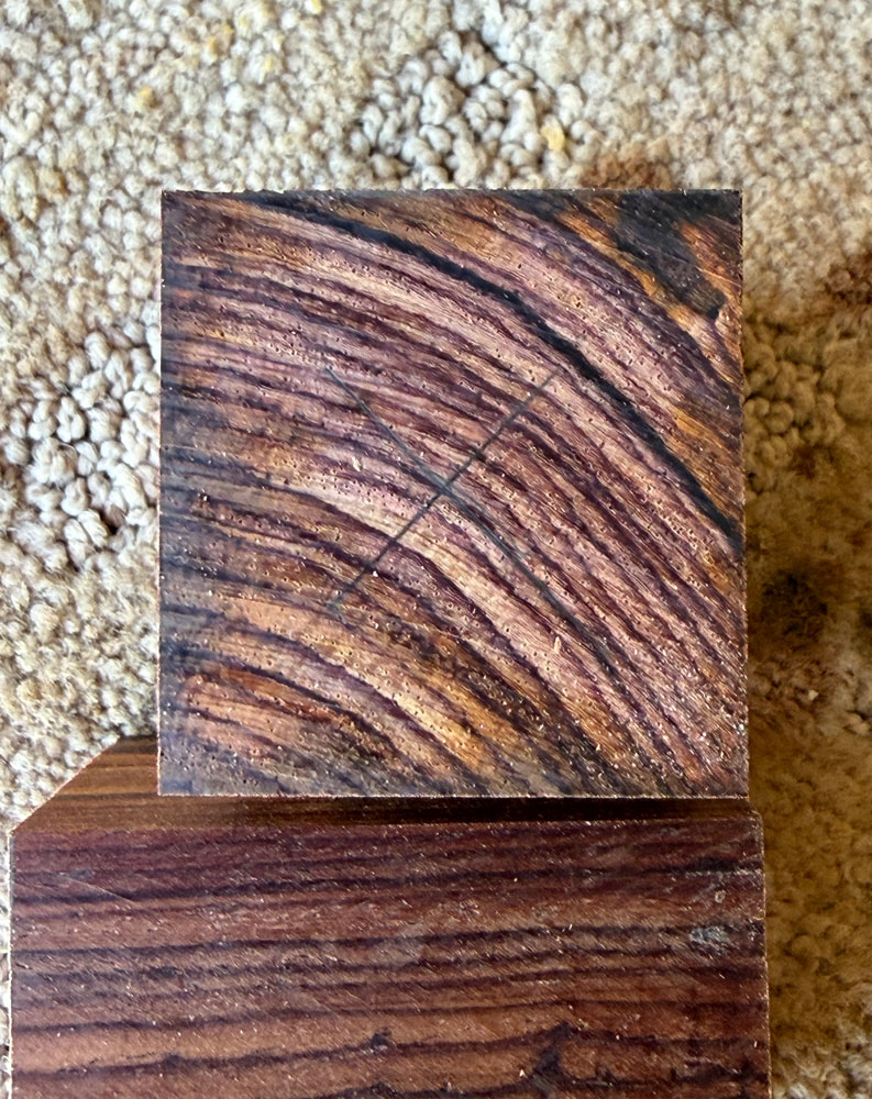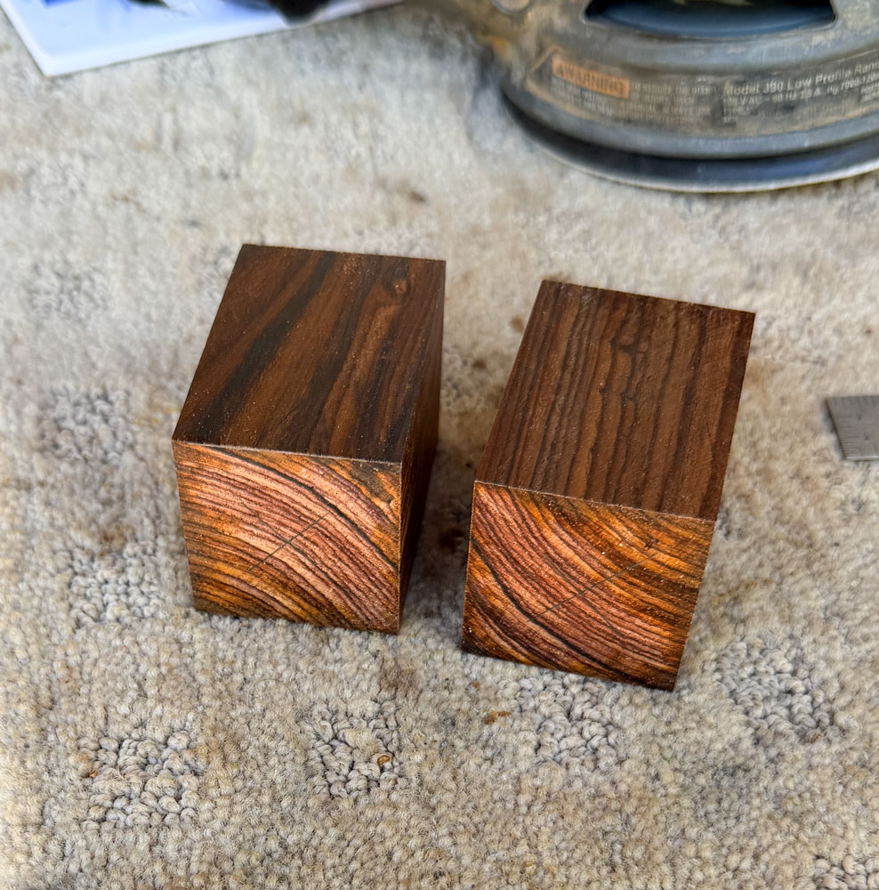 Now, I'll talk about how I made these.  I started with two pieces of cocobolo, about 1.5 inches square and 2.25 inches long.