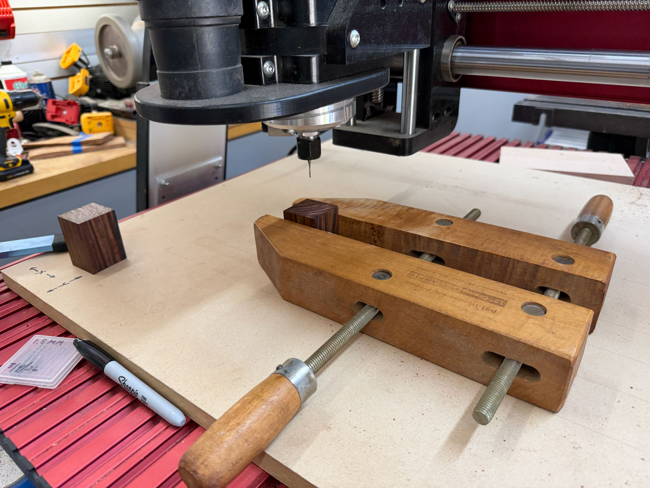 I took the blanks to my CNC and clamped them in a wooden clamp.  The clamp is fastened to the spoil board with double sided tape.