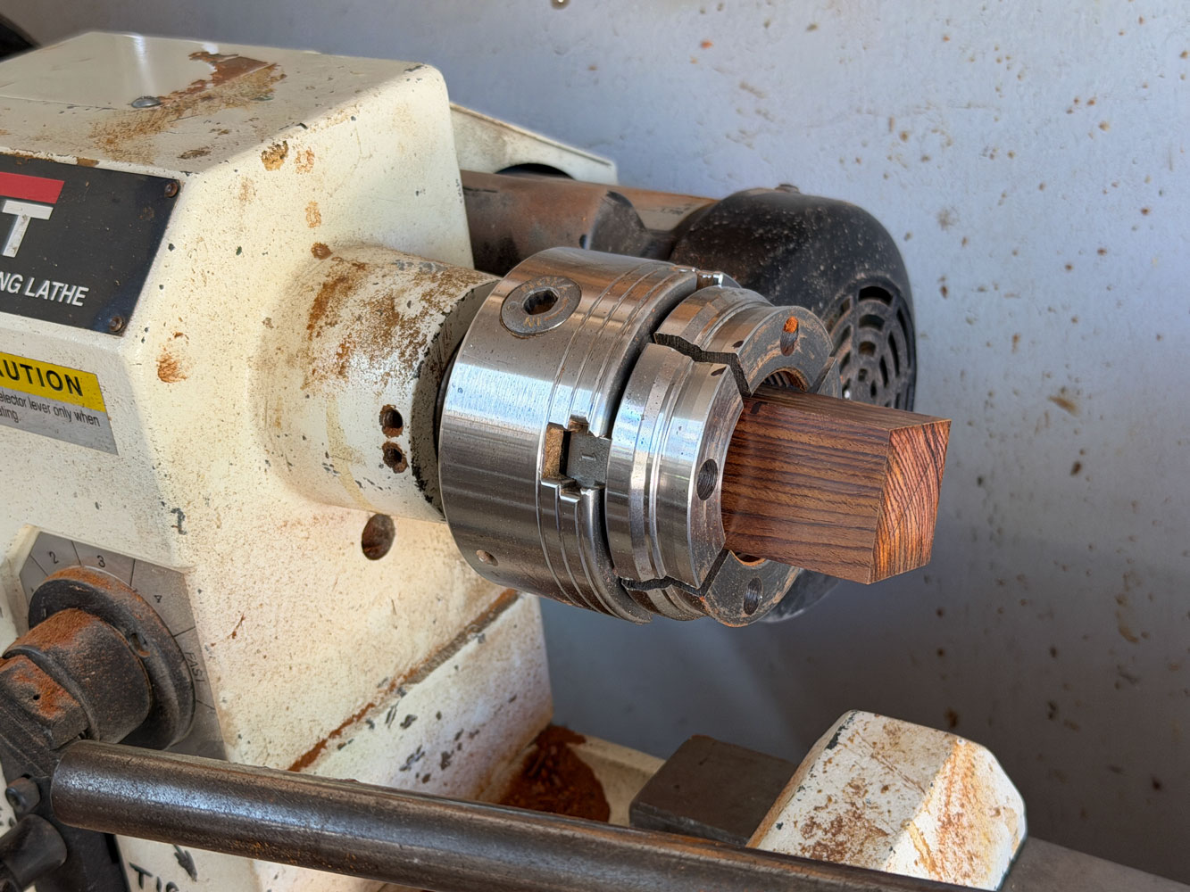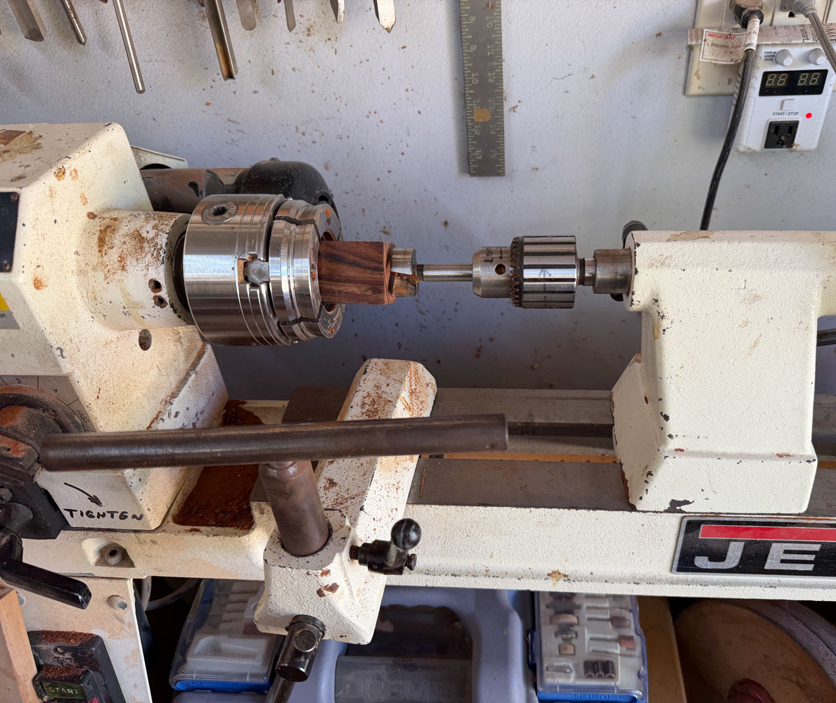 Now I'll go to the lathe.  I'm not an expert turner but I manage.  The first thing I'm going to do is drill out the center.  I clamp the blank in a chuck, with the bottom pointing toward the tail stock.