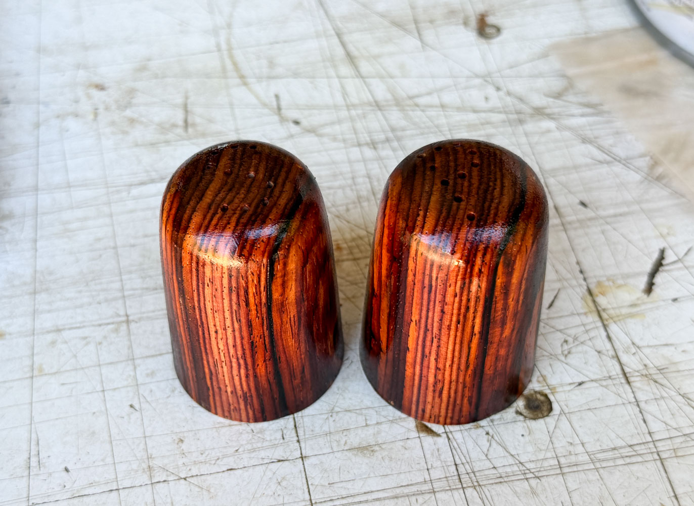 Beyond that, I used a 1 inch hole for the storage of the salt or pepper, and I shaped the shaker somewhat like a thimble.  Here's how they came out.