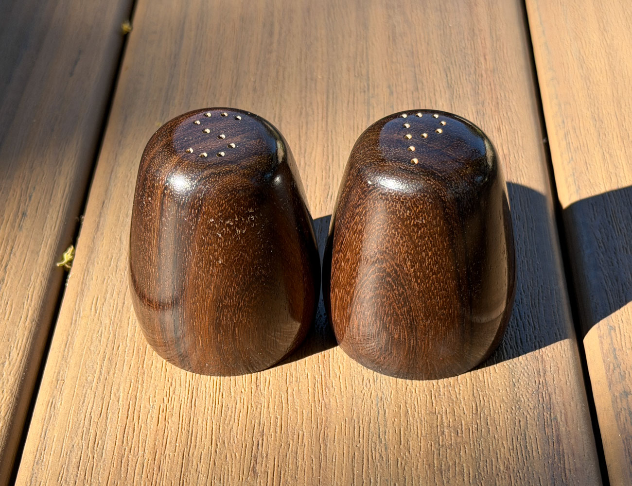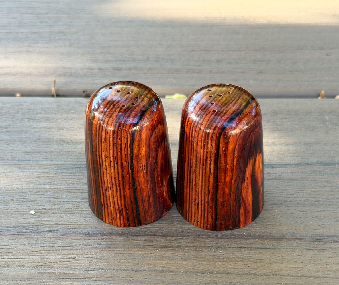 Here are two pictures of salt and pepper shakers that I made. The ones on the left are cocobolo and the ones on the right are walnut (I think).
