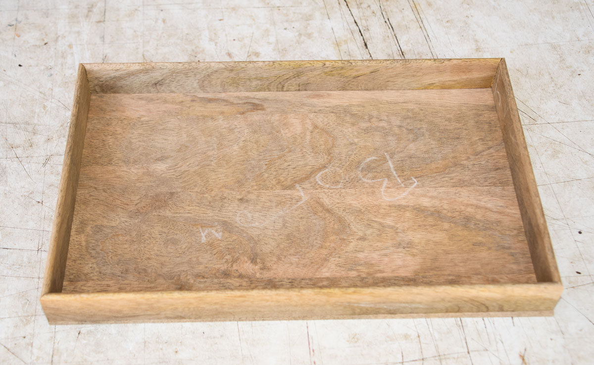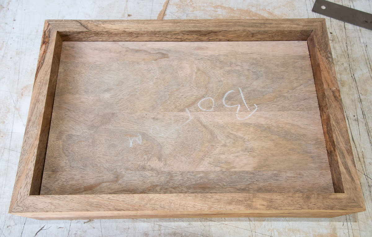 Next, I'm going to work on making the tray. I take the panel I made for the bottom of the tray and place it in the box to mark the length. You can see my mark on the right side of the picture.