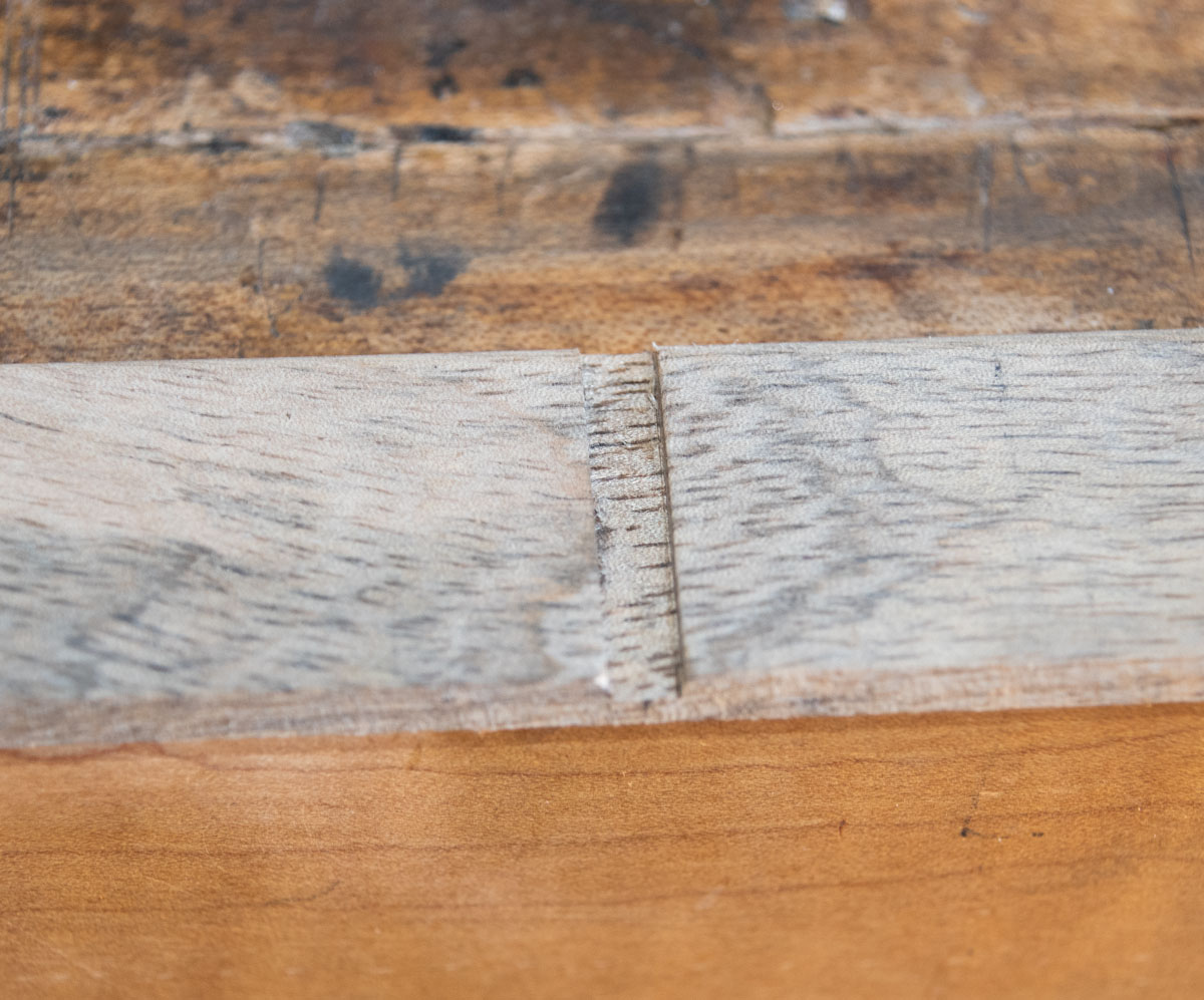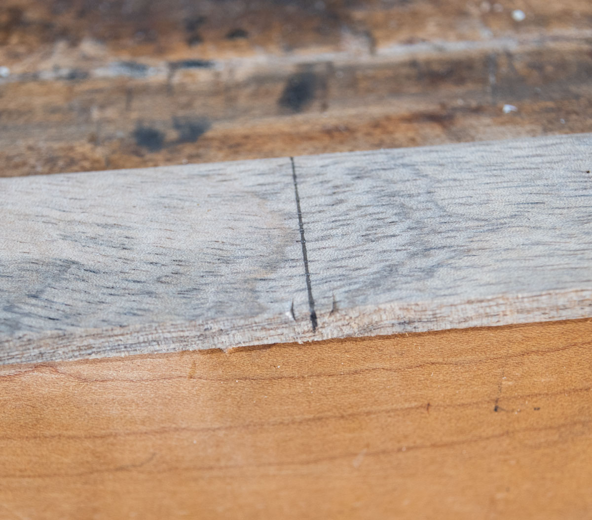 Now, I want to cut the panel to width. I glued up pieces to make the panel and I want one of the seams in the middle. So I mark the center of one side, line up the seam with that mark and then mark the width. My marks are shown at the arrows.