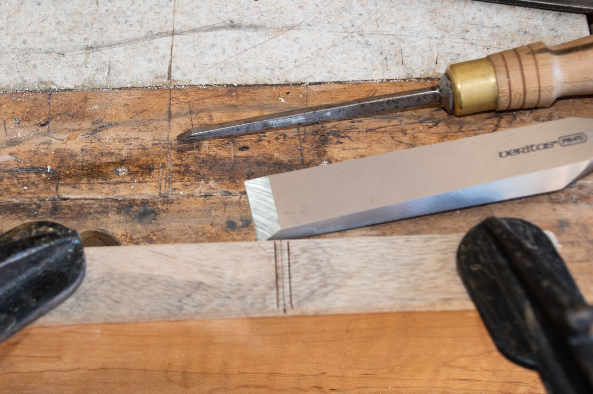 Then I use a 1 inch chisel to make downward cuts in those lines, and a 1/8 inch chisel to clean out the waste.