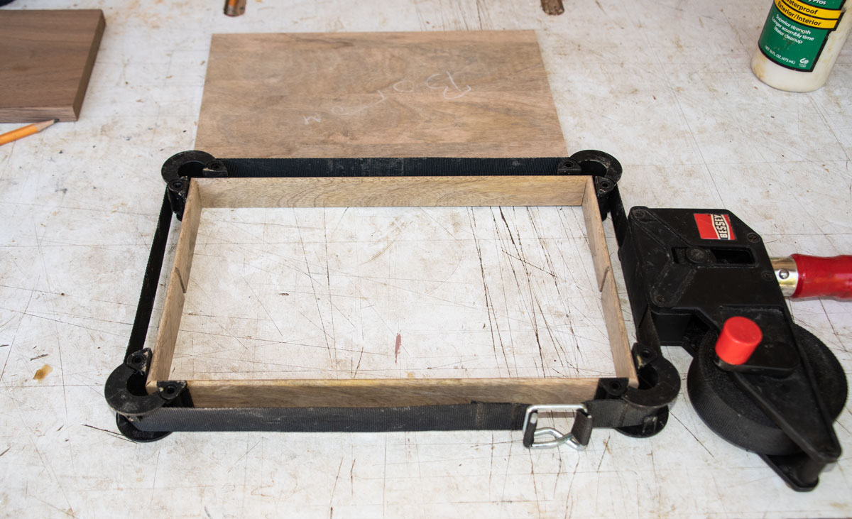 I mark the long side of the tray by laying one of the side pieces on the tray bottom. Remember that I said the tray bottom was too tight - so I want to make the sides a bit shorter. The amount I "short" the side is shown in the next picture.