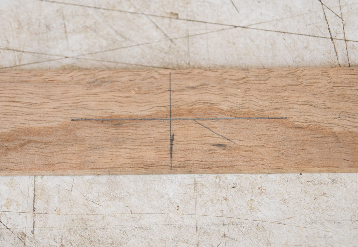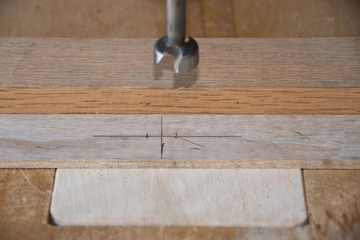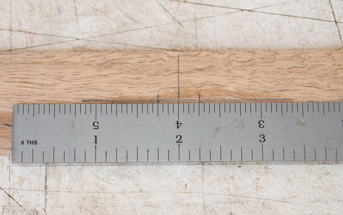 I'm going to drill two 3/4 inch holes. A 3/4 inch bit has a radius of 3/8 inch and I want to two holes to overlap. So I make marks 1/4 inch from the center.