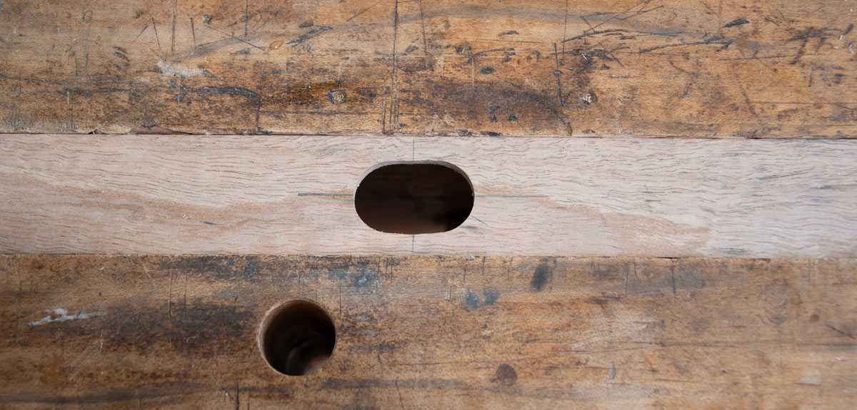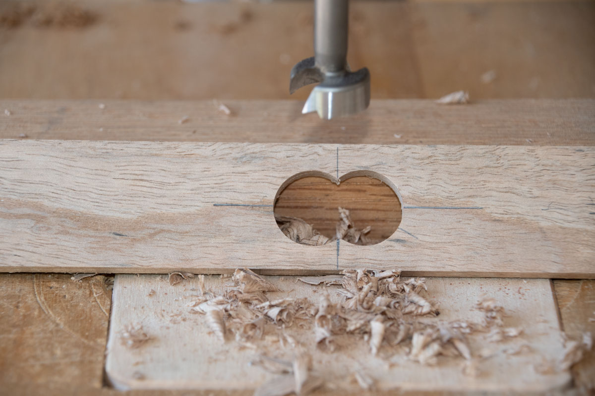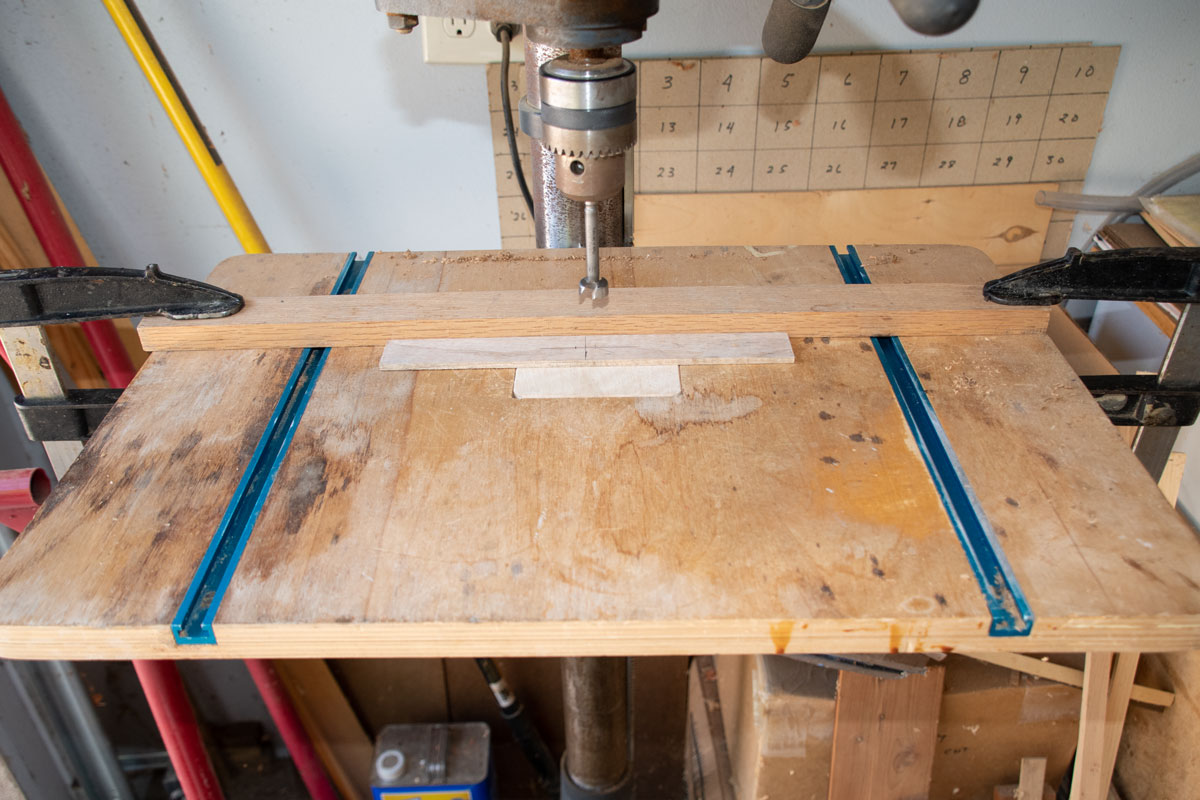 Then I take the center piece to the drill press. Note that I have a stop board on the drill press. This is to make sure the two holes are aligned side-to-side and one is not higher or lower than the other.