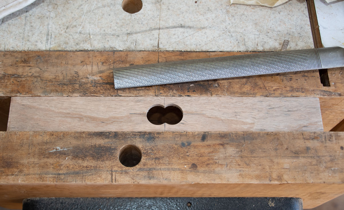 Then I take it to my vise and use a rasp to smooth out the finger hole.