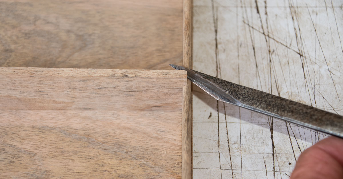 Now I'm going to work on the center piece of the tray. First, I'll cut it to length. Note the mark on the right side. You want to sneak up on this cut to make it a good, tight fit.