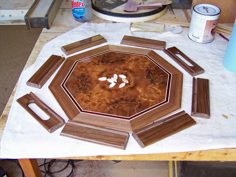 When the sides have a sufficient number of coats, and are quite dry, we're ready to assemble the sides to the tray bottom. Check the numbers you put on the sides to make sure everything is in the right place. Note the biscuits with one end cut off.
