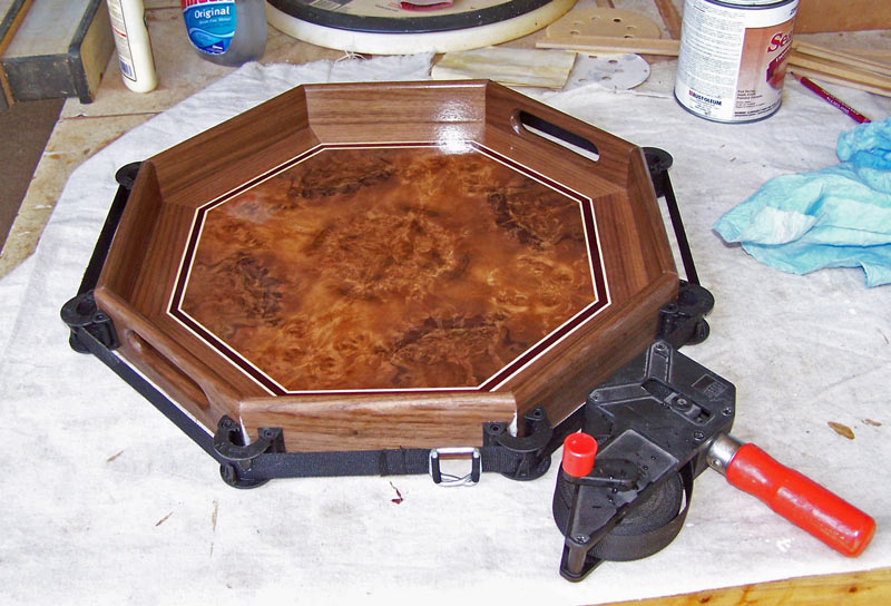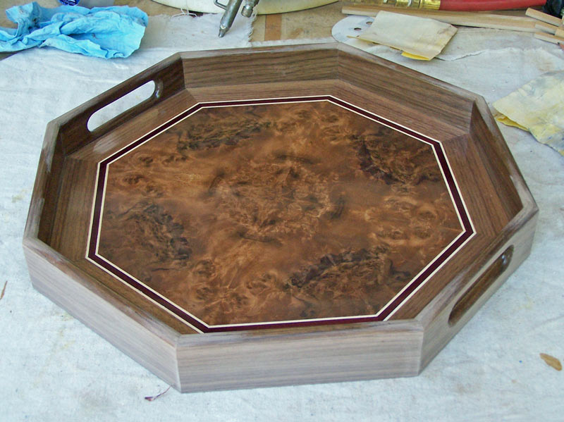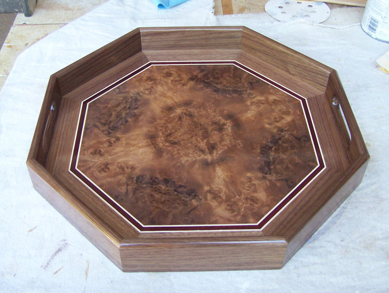 Here's the tray sitting on the lazy Susan ready for the lacquer. Note how the grain flows around the tray sides, both inside and outside.