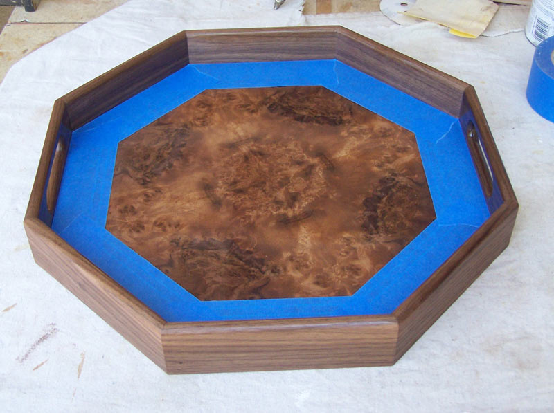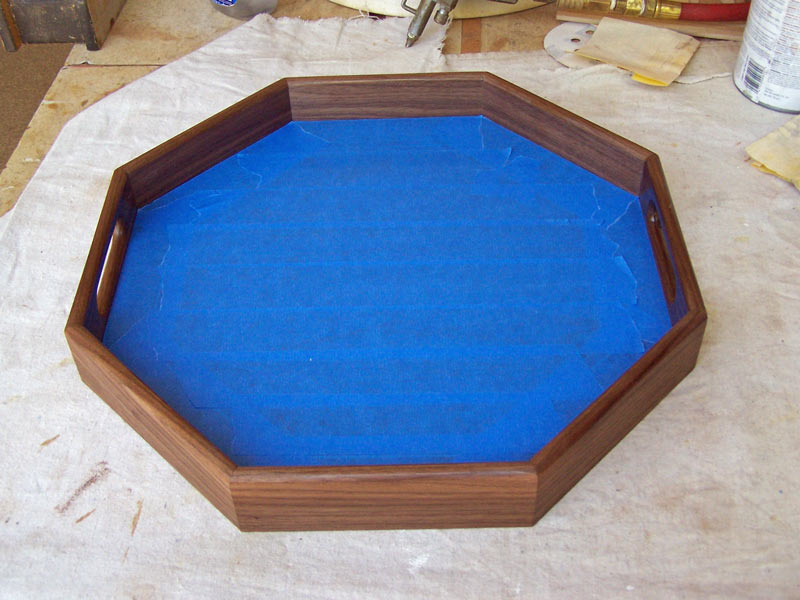 I spent a lot of time getting the tray bottom to a glass-like finish so I don't want the overspray marking it all up - so I mask off the tray bottom. I wiped on dewaxed shellac on the sanded part after I masked off around the sides. It's better to wait until you mask off everything but I got ahead of myself.
