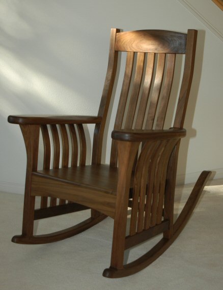 The rocker is built from walnut. Walnut is not a traditional craftsman wood, but the dark color fits well with the dark, ammonia fumed, quarter sawn oak commonly used for craftsman furniture.