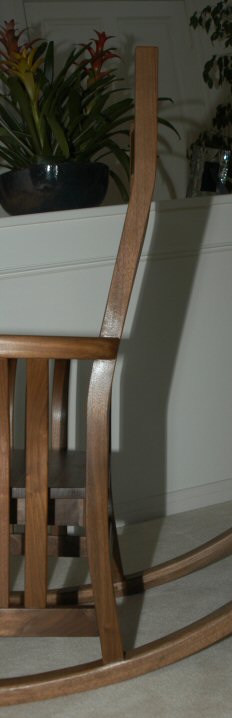 Much of their other furniture is in the craftsman style so they asked me to build the rocker in that style. I’m not a big fan of the craftsman style so I went searching for something that would fit with their other furniture but would not be strictly craftsman. It’s based on an original by Jay Speetjens that I saw in a 1995 issue of Woodwork. All I had was a picture to work from – there were no plans or details in the magazine. The thing I liked about the design is that it has a “craftsman” flavor without being completely rectilinear. I especially liked the curved side slats – the side slats say “craftsman” but the curves give it a more modern look.