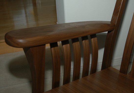 I was lucky with the crest rail – the grain figure came out really well and generally centered. The crest rail was cut from a piece of 8/4 plane sawn walnut. I cut the tenons before cutting the curves. To try to appreciate the work our ancestors had to go through, I cut the back curve of the crest rail by hand, using planes to cut away the excess material. The front curve would have been too hard to do by hand so I cut that on the band saw at school and smoothed it with a spokeshave.