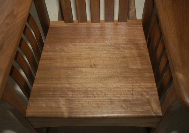 The seat is flat – designed for the addition of a tied on cushion. To minimize wood movement, I made the seat from quarter sawn walnut. The seat is only glued to the frame in the front. The rear of the seat is held down by the back slats. This allows the seat to move, i.e., expand and contract, in relation to the chair frame.