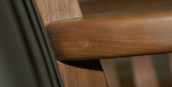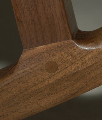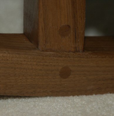 The rockers were attached to the legs with 3/4 inch dowels. The dowels were glued and also pinned with screws that went completely through the dowels. The screw holes were placed on the inside where they would be hard to see, and plugged with a walnut plug. A back leg is shown at left and a front leg at right. The hole in the front leg is made behind the leg and doesn’t show in the picture at right.