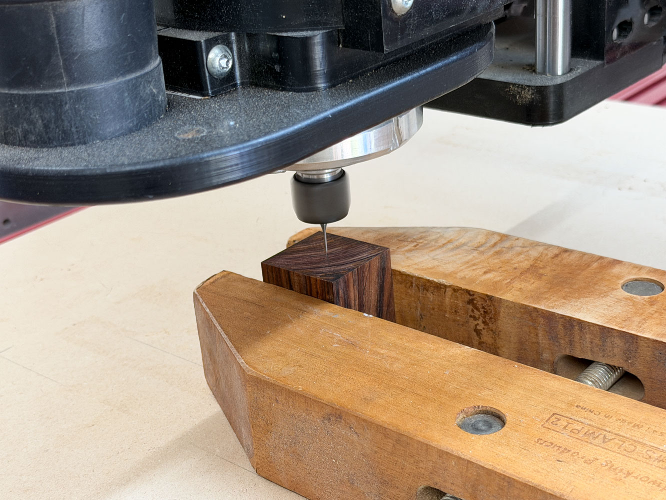I took the blanks to my CNC and clamped them in a wooden clamp.  The clamp is fastened to the spoil board with double sided tape.