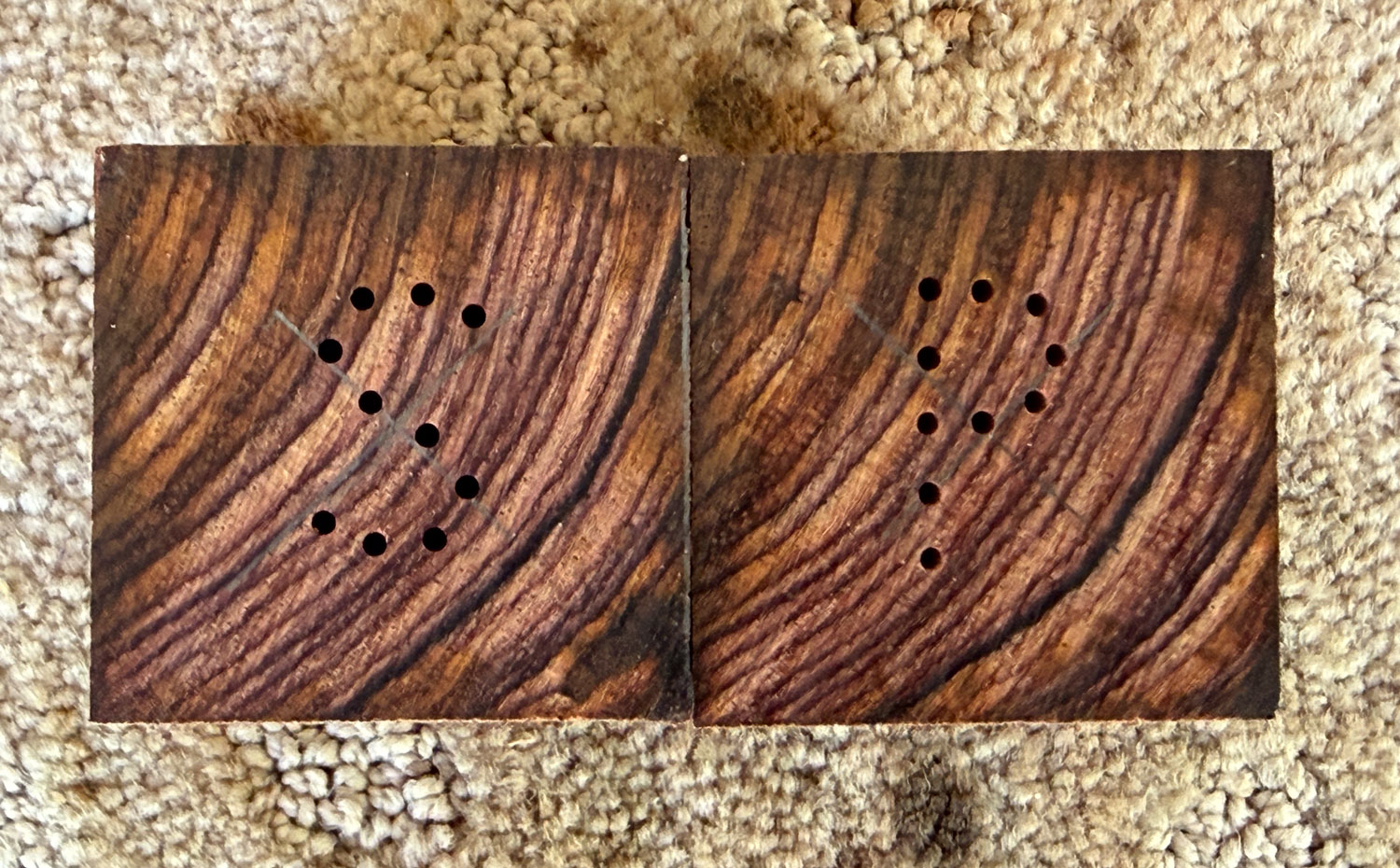 Now, I'll talk about how I made these.  I started with two pieces of cocobolo, about 1.5 inches square and 2.25 inches long.