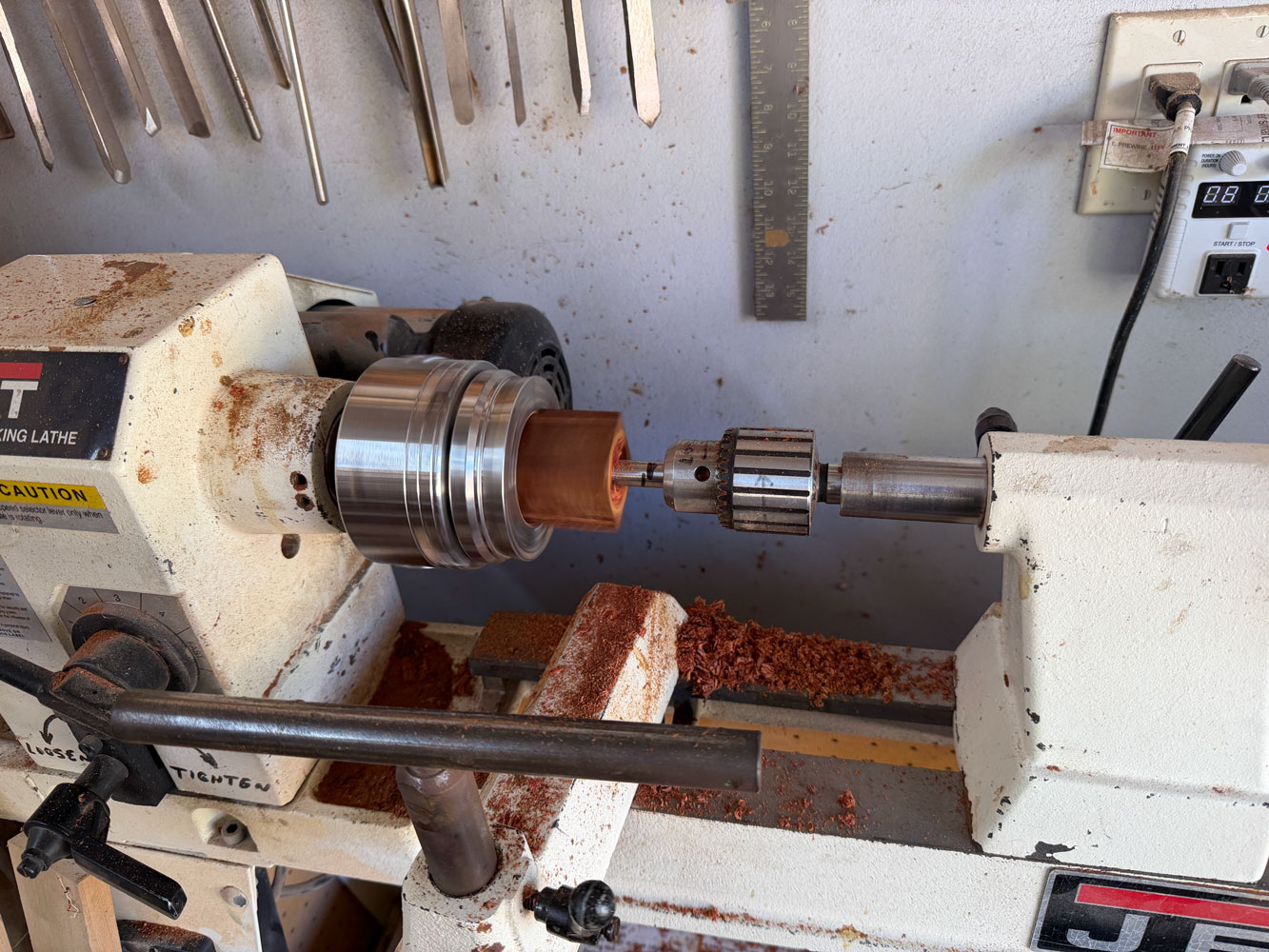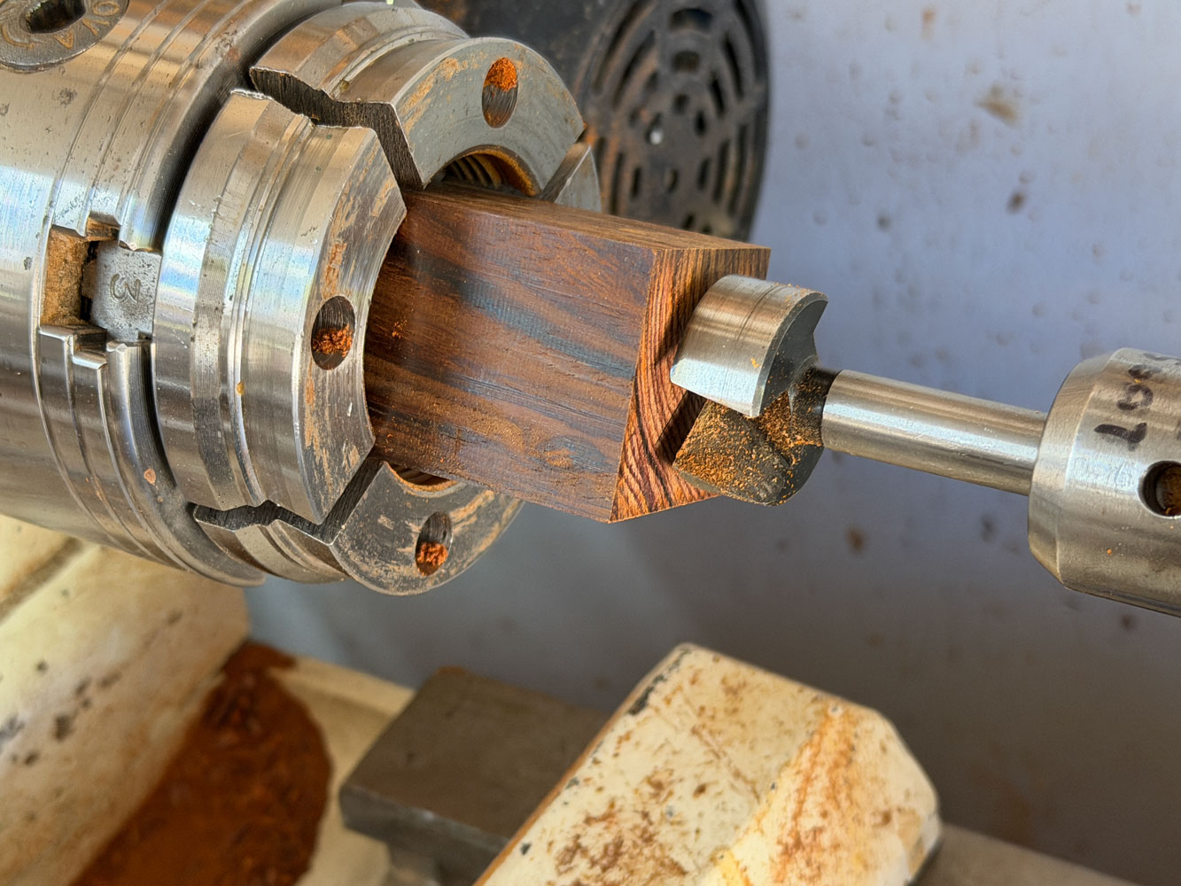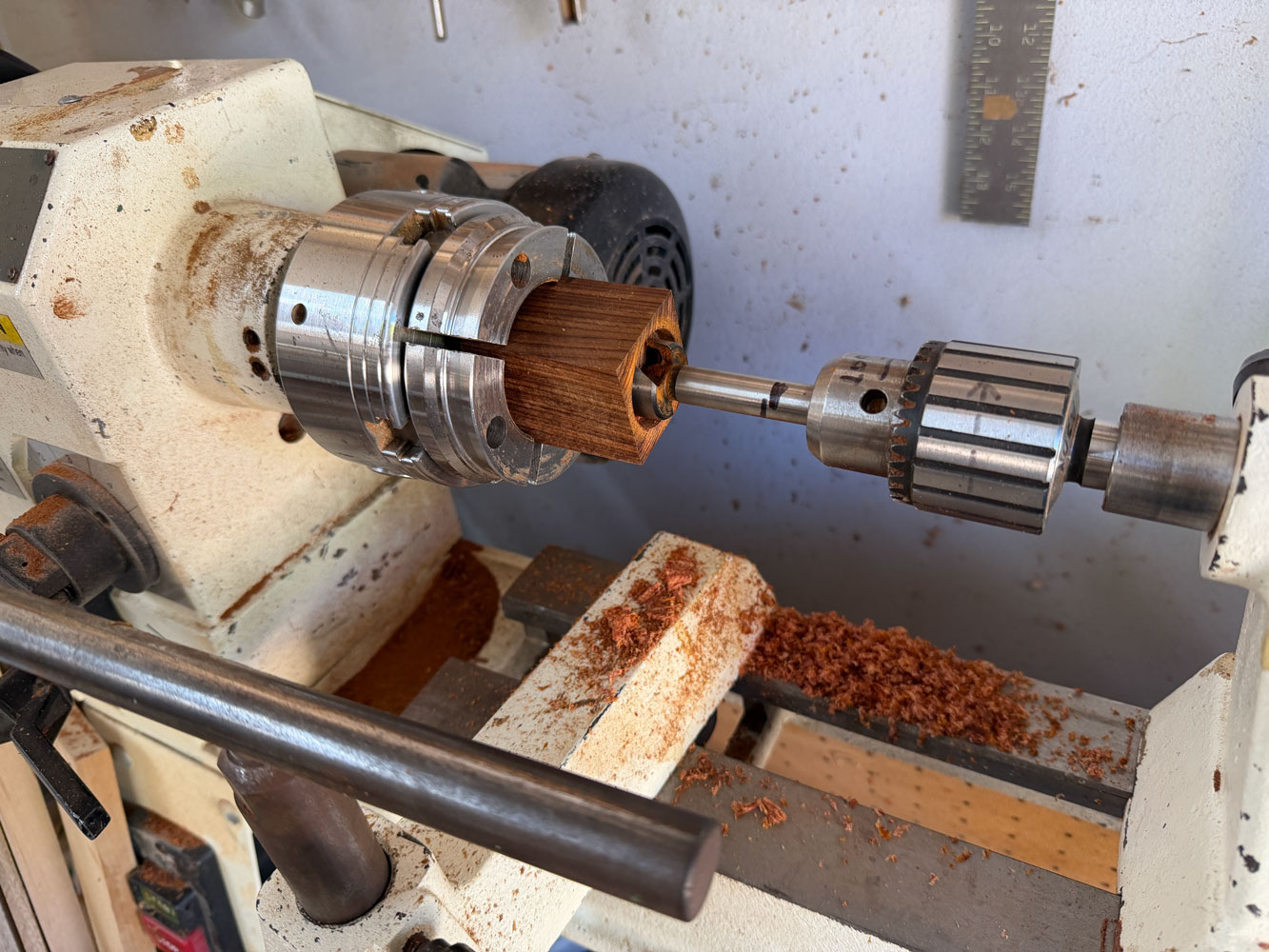 Now I'll go to the lathe.  I'm not an expert turner but I manage.  The first thing I'm going to do is drill out the center.  I clamp the blank in a chuck, with the bottom pointing toward the tail stock.