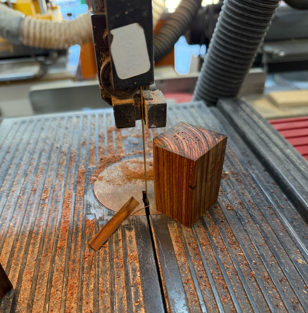 Before I go back to the lathe to turn the blank round I go to my bandsaw and cut the four corners back.  This speeds up getting the blank round, and avoids some of the hammering as you initially cut into the blank.